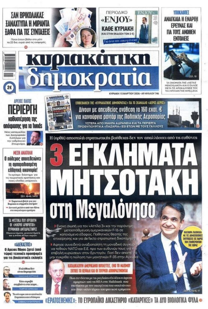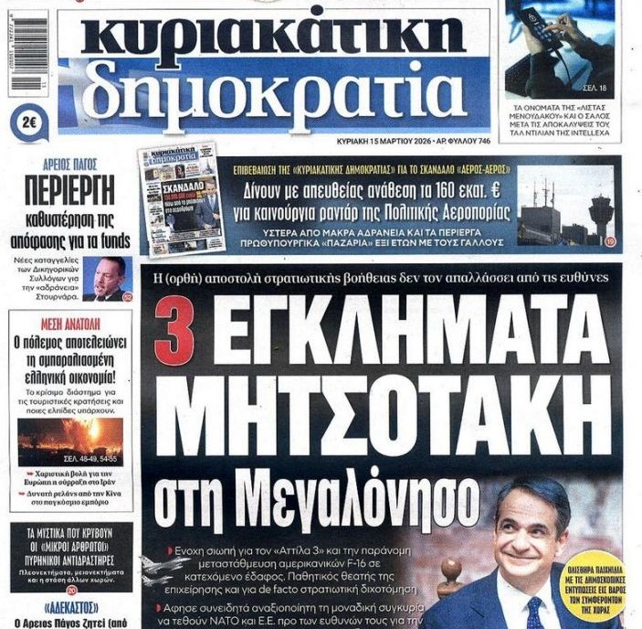 15 Μαρτίου 2026: Το πρωτοσέλιδο της Κυριακάτικης Δημοκρατίας – Τα 3 «εγκλήματα» Μητσοτάκη στη Μεγαλόνησο