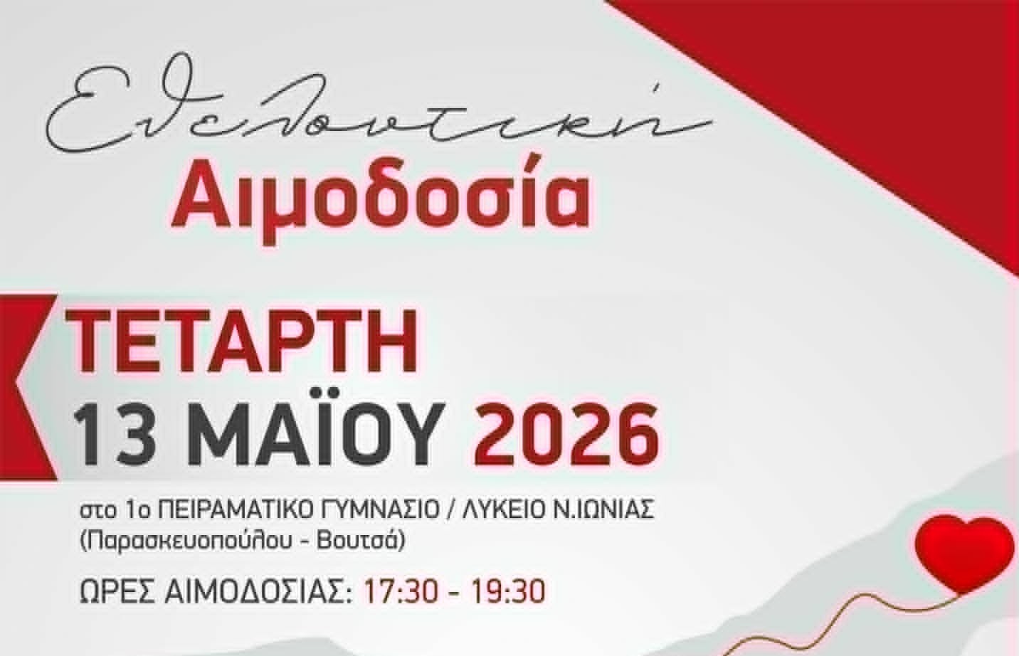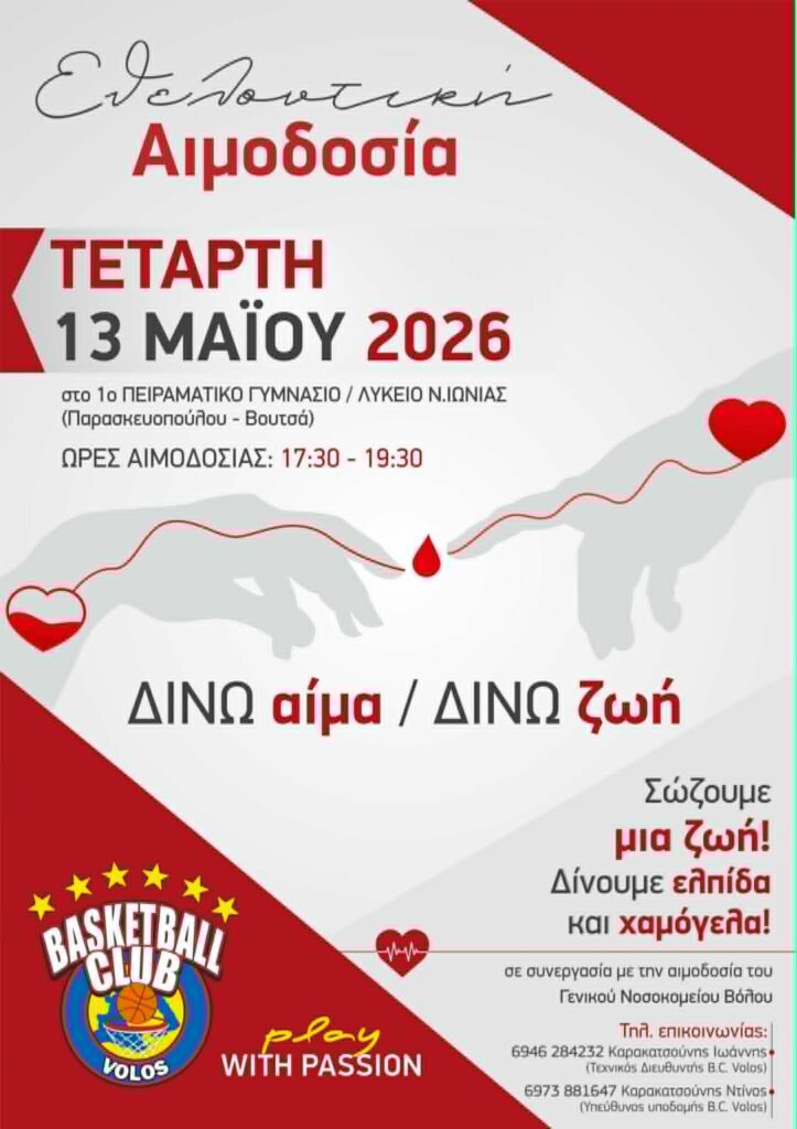 Η δράση θα πραγματοποιηθεί την Τετάρτη 13 Μαΐου 2026, από τις 17:30 έως τις 19:30, στο 1ο Πειραματικό Γυμνάσιο / Λύκειο Νέας Ιωνίας (Παρασκευοπούλου – Βουτσά), σε συνεργασία με την αιμοδοσία του Γενικό Νοσοκομείο Βόλου.
