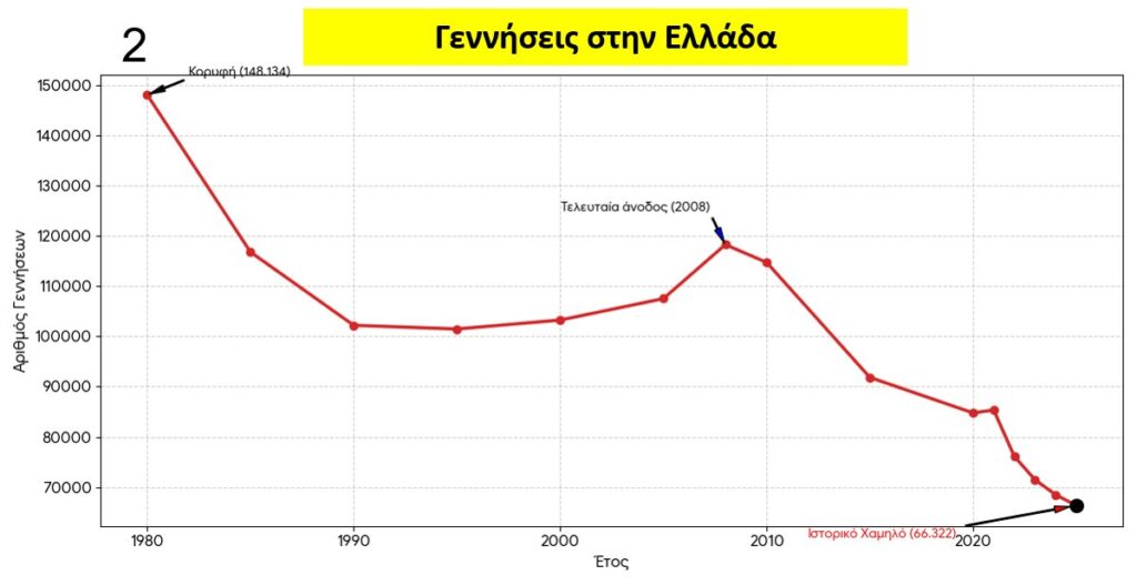 - Μείωση γεννήσεων κατά 3% ετησίως (από 84.764 το 2020 σε 66.322 το 2025).