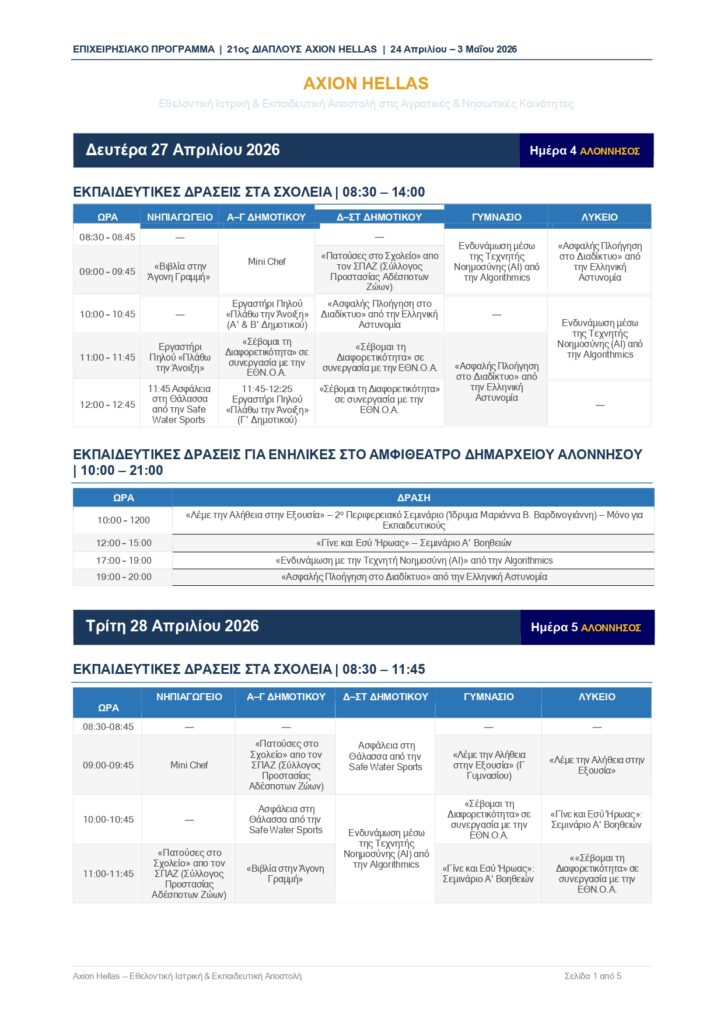 Ο φετινός διάπλους, που πραγματοποιείται από τις 24 Απριλίου έως τις 3 Μαΐου 2026, περιλαμβάνει ένα πλούσιο πρόγραμμα δράσεων στην Αλόννησο, καλύπτοντας ένα ευρύ φάσμα αναγκών της τοπικής κοινωνίας.