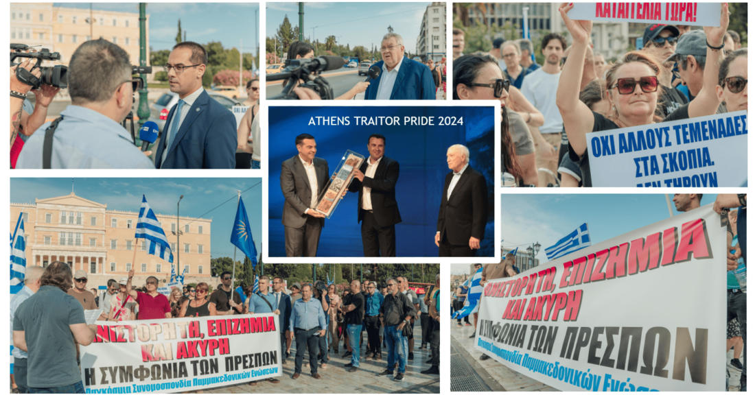 17 και 18 Ιουνίου 2024, επί ημερών δηλαδή Μητσοτάκη, η προδοτική συμφωνία των Πρεσπών γιόρτασε τα γενέθλιά της, με όλους τους προ εξαετίας δράστες επί σκηνής: Στο Ωδείο Αθηνών, ο Τσίπρας, ο Ζάεφ και οι φίλοι τους σε ένα ψευτοσυνέδριο με αλληλοβραβεύσεις, προσβάλλουν την ιστορία και τη μνήμη όλων μας.