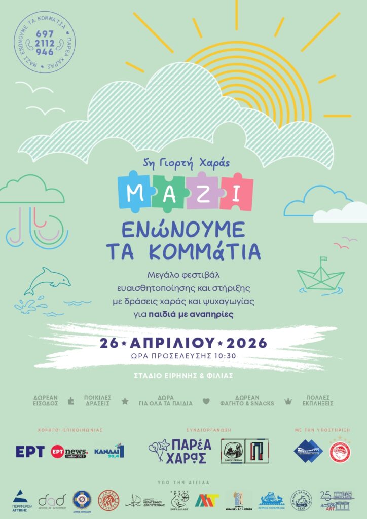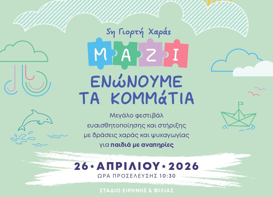 Κυριακή 26 Απριλίου: «Μαζί Ενώνουμε τα Κομμάτια» – Μεγάλο φεστιβάλ χαράς για παιδιά με αναπηρίες στο Στάδιο Ειρήνης & Φιλίας