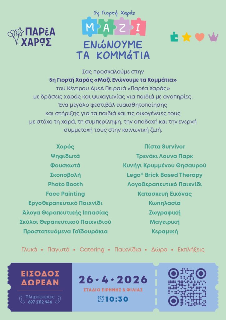 Την Κυριακή 26 Απριλίου 2026, το Στάδιο Ειρήνης & Φιλίας μετατρέπεται σε ένα γιγαντιαίο πάρτι αγάπης και συμπερίληψης. Το Κέντρο ΑμεΑ Πειραιά «Παρέα Χαράς» διοργανώνει για 5η συνεχή χρονιά τη Γιορτή Χαράς «Μαζί Ενώνουμε τα Κομμάτια», ένα μεγάλο φεστιβάλ ευαισθητοποίησης και στήριξης για παιδιά με αναπηρίες και τις οικογένειές τους.