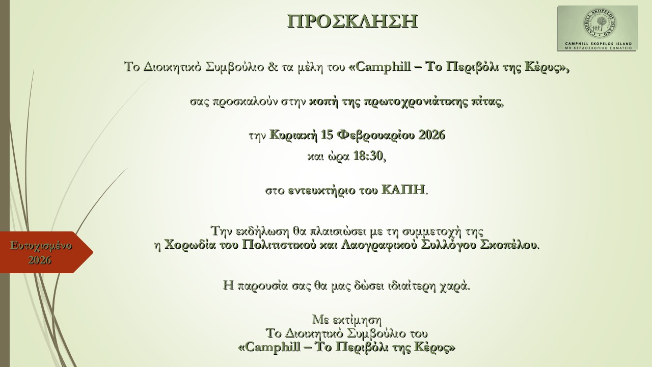 Την Κυριακή 15 Φεβρουαρίου 2026, στις 18:30, στο εντευκτήριο του ΚΑΠΗ, το Διοικητικό Συμβούλιο και τα μέλη του Camphill κόβουν την πρωτοχρονιάτικη πίτα τους, σε μια βραδιά γεμάτη ευχές, ανθρώπινη επαφή και πολιτισμό.
