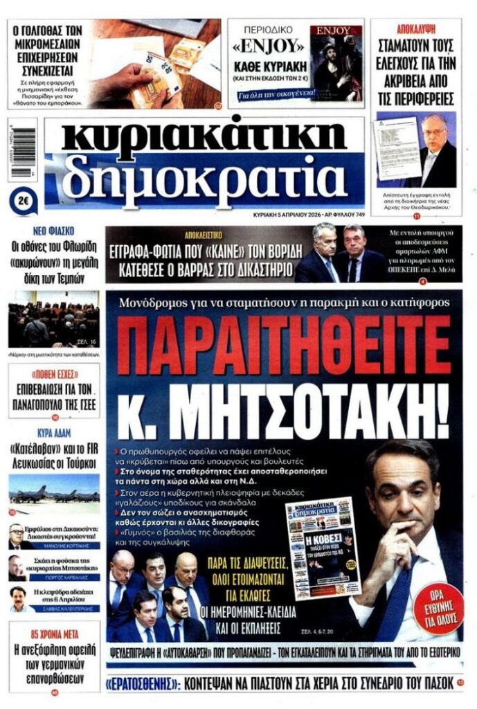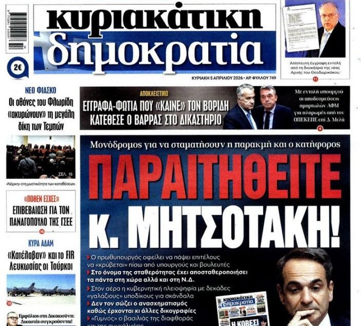 Το αυριανό πρωτοσέλιδο της Κυριακάτικης Δημοκρατίας (Κυριακή 5 Απριλίου 2026) επιλέγει να ανεβάσει κατακόρυφα τους τόνους, με ένα ηχηρό και ευθέως επιθετικό μήνυμα προς τον πρωθυπουργό Κυριάκο Μητσοτάκη.