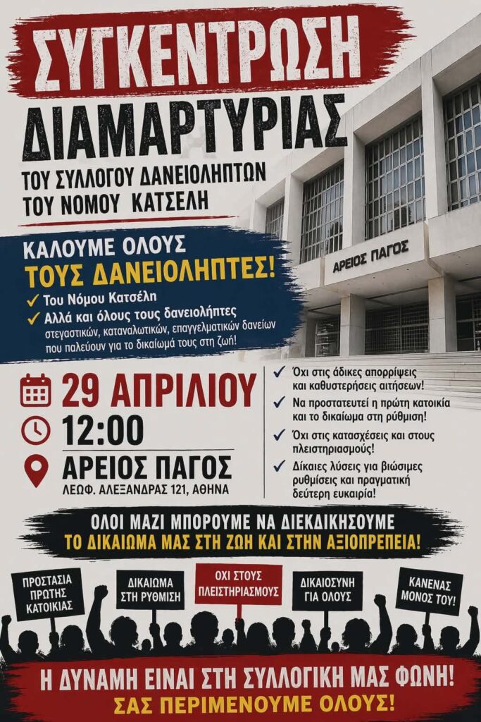 Η συγκέντρωση αναμένεται να αποτελέσει σημείο αναφοράς για τον αγώνα των δανειοληπτών, σε μια περίοδο όπου τα ζητήματα των χρεών και της προστασίας της κατοικίας επανέρχονται δυναμικά στο προσκήνιο.